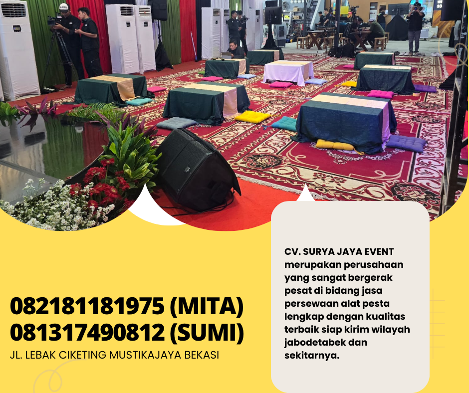 CV. SURYA JAYA EVENT merupakan perusahaan yang bergerak pesat dibidang jasa persewaan alat pesta lengkap termasuk meja lesehan dengan kualitas produk yang sangat bagus siap kirim area jakarta.